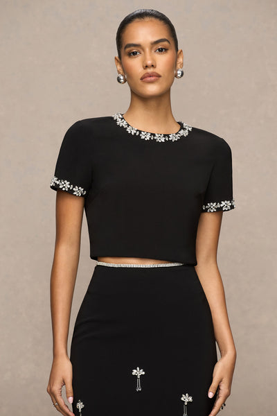 Tritt auf in müheloser Eleganz mit Aven. Gefertigt aus unserem hochwertigen schwarzen Crêpe, besticht dieser Maxirock durch eine schmeichelhafte Silhouette, die sich wunderschön legt. Der verzierte Bund verleiht einen Hauch von Glamour, während die feinen Verzierungen über den gesamten Rock hinweg den Look dezent veredeln. Ein Schlitz hinten in der Mitte sorgt für Bewegungsfreiheit und einen subtilen Hauch von Raffinesse. Kombiniert mit unserem Salma-Top entsteht ein Look voller schicker Eleganz.