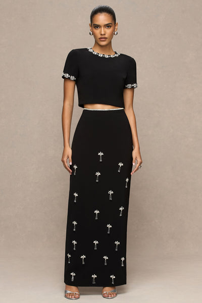 Verleihe deinem Occasion-Look ein Update mit Salma. Aus unserem hochwertigen schwarzen Krepp gefertigt, besticht dieses Cropped-Top durch eine elegante, figurbetonte Passform. Ausschnitt und kurze Ärmel sind mit feinen Verzierungen geschmückt und sorgen für einen Hauch Glamour. In Kombination mit unserem Aven Rock entsteht ein atemberaubender, perfekt abgestimmter Look.